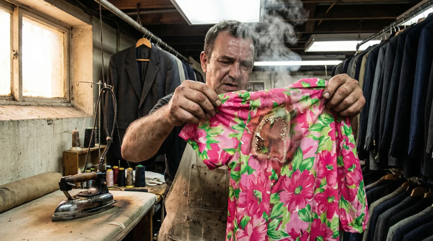 When a fast-fashion garment encounters a tailor’s iron, the degradation is rarely a slow, easily preventable process. It happens in the blink of an eye. Because these fabrics are extruded plastics spun into microscopic threads, they lack the cellular moisture retention of natural plants or animal hairs. Therefore, when extreme dry heat or superheated steam is applied, the structural integrity of the weave collapses. Tailors have learned to categorise these failures rapidly, often diagnosing the exact chemical makeup of the cheap blend simply by observing how it reacts to ambient radiant heat before the iron even touches the fabric. Studies confirm that micro-plastics behave unpredictably under pressure, and understanding the warning signs is vital for anyone attempting to care for these garments at home.