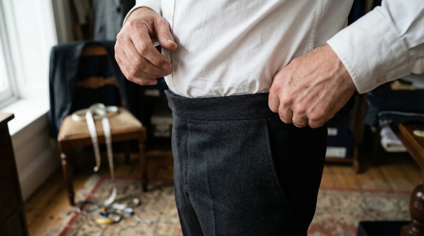 However, the most closely guarded secret among master tailors completely contradicts this widespread high street myth. There is one precise, structural adjustment—a remarkably simple alteration in trouser architecture—that visually subtracts up to fourteen pounds from your silhouette within seconds. Unlocking this structural mechanism not only eradicates the dreaded fabric pooling around the hips but fundamentally engineers a taller, leaner profile without requiring a single minute on the treadmill.
