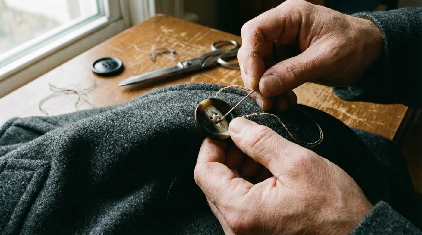 Remove the factory buttons carefully using a seam ripper, ensuring you do not damage the structural integrity of the melton wool. When attaching the horn replacements, use a doubled length of 30-weight thread. Crucially, do not sew the button flush against the fabric. You must create a ‘thread shank’.